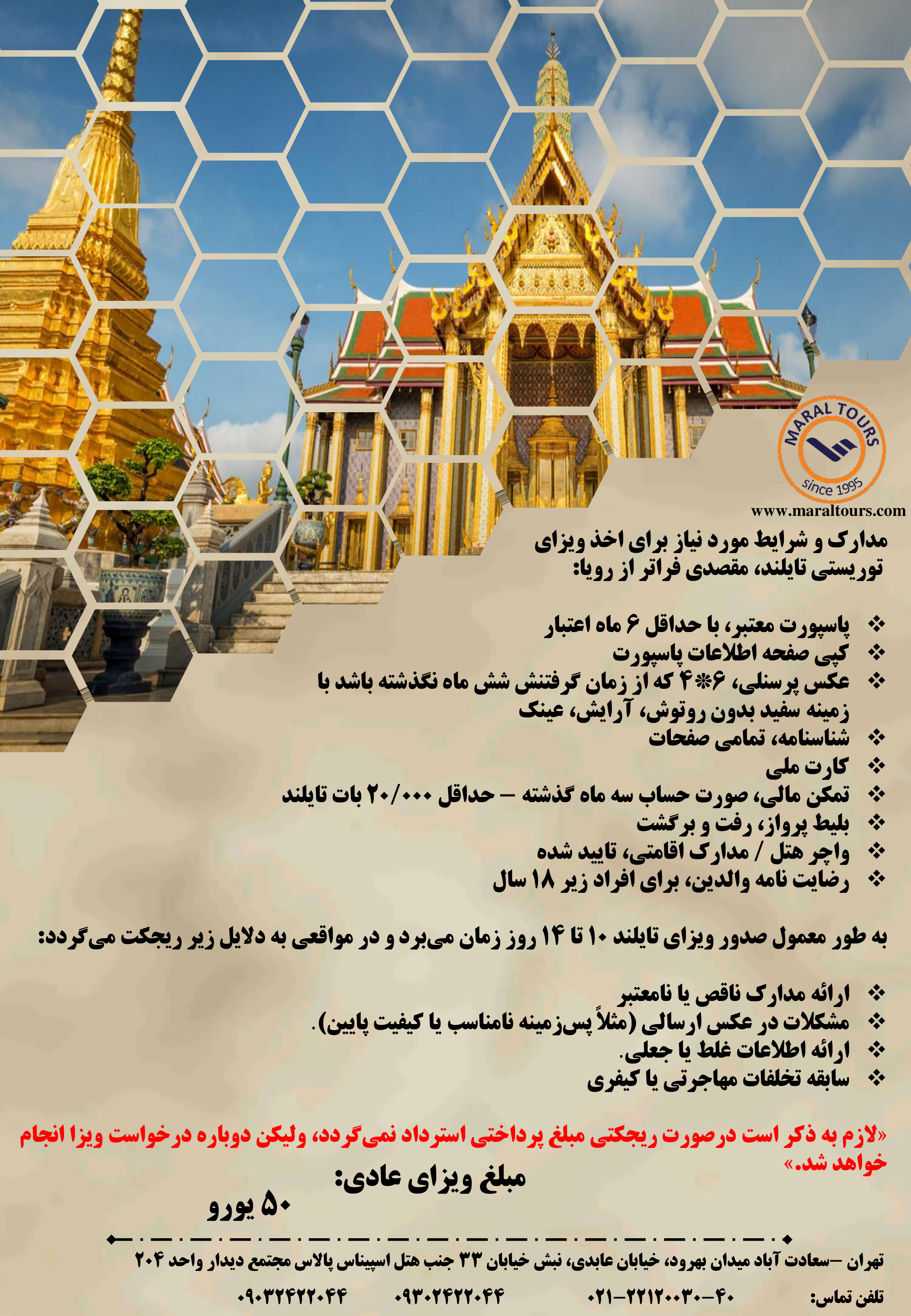 سفر به تایلند میتواند تجربهای رویایی باشد، اما گرفتن ویزا، رزرو پرواز و هتل و برنامهریزی سفر گاهی وقتگیر و گیجکننده است، ما در مارال تورز اینجاییم که روند تمام این کارها را برایتان تسهیل کنیم. به راحتی و با کمترین دردسر میتوانیم ویزایتان را بگیریم، پرواز و هتل را برایتان رزرو کنیم، با ما سفری بی دغدغه را تجربه خواهید کرد.
